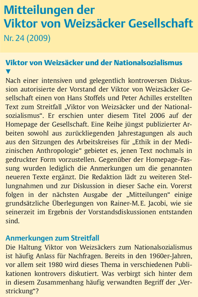 Strittig ist insbesondere der Zusammenhang zu Weizsäckers ärztlichen Schriften. In zwei seiner Texte aus den Jahren 1933/34 verwendet er den Begriff einer zu entwickelnden ärztlichen Vernichtungslehre. Während manche Autoren einen Zusammenhang zur Ideologie des Nationalsozialismus sehen, deuten andere sie als begriffliche Anpassung, welche zugleich inhaltlichen jeder ärztlichen Rechtfertigung der Ermordung von Menschen mit Behinderungen widerspricht. Da sich seit der ersten Stellungnahme des Vorstands der V. v. Weizsäcker Gesellschaft durch die medizinhistorische Forschung wesentliche Neuerungen ergeben haben, nimmt der aktuelle Vorstand der Viktor von Weizsäcker Gesellschaft erneut wie folgt Stellung...